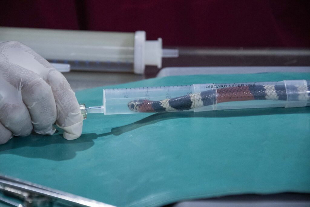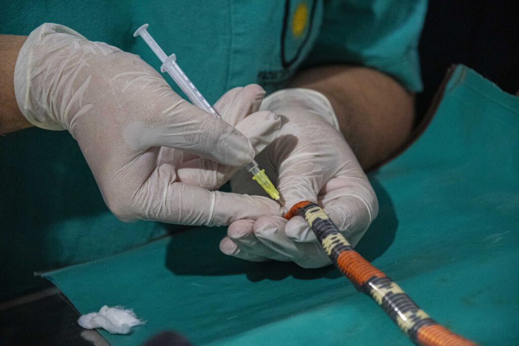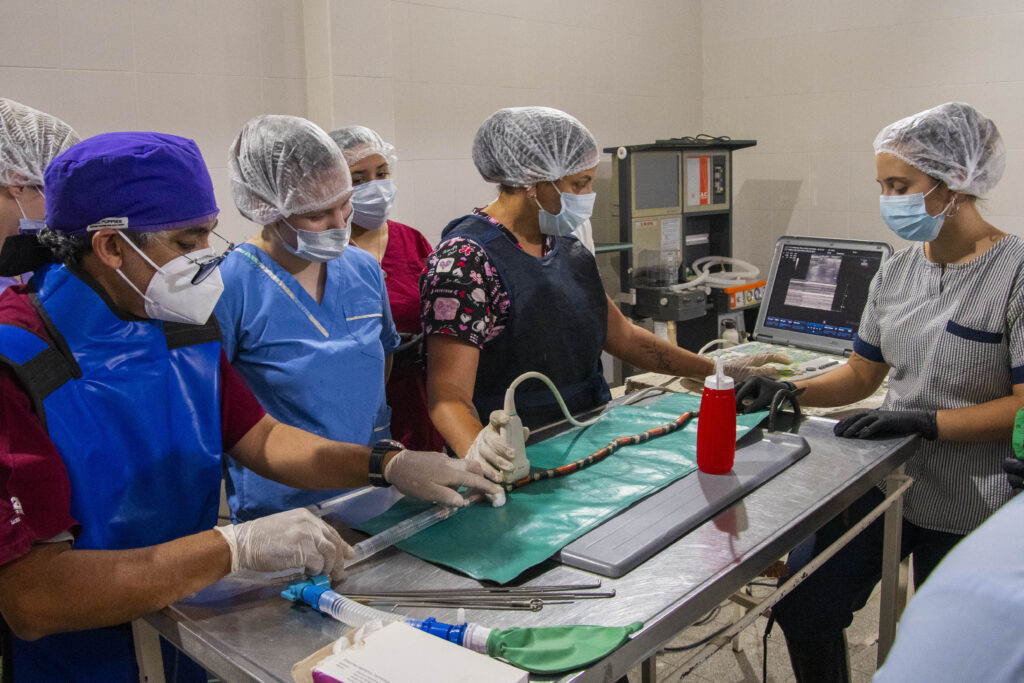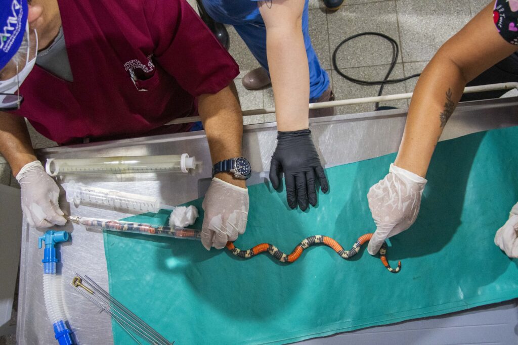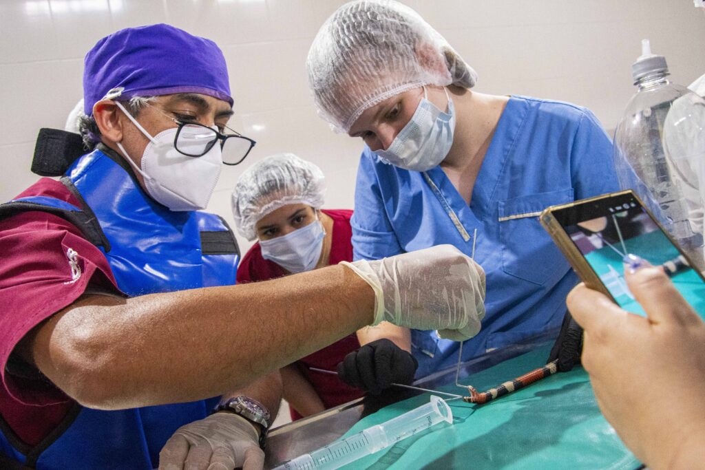 Dada la alta toxicidad del veneno de la serpiente coral, todas las maniobras se realizaron bajo anestesia, siguiendo estrictos protocolos de seguridad. El equipo de trabajo estuvo integrado por profesionales especialistas del Hospital Escuela Veterinario, MV Juan José López y Carolina Repetto.