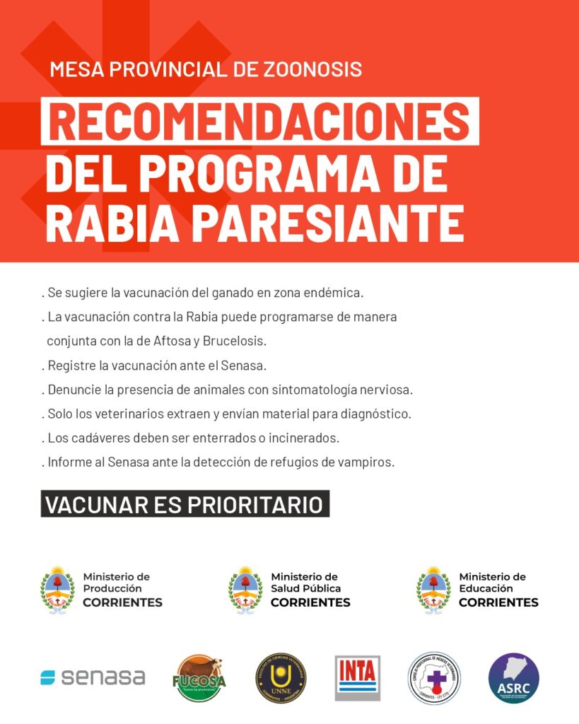 La Facultad de Ciencias Veterinarias de la UNNE informa a la comunidad que, como institución, adhiere a las recomendaciones emitidas por la Mesa Provincial de Zoonosis en el marco del Programa de Rabia Paresiante, con el objetivo de fortalecer la prevención y el control de esta enfermedad en zonas endémicas.